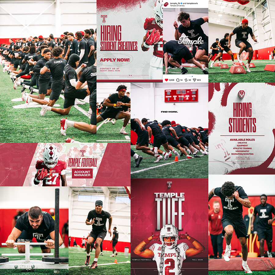 Capturing the excitement and energy of athletic competition using dynamic visuals. These compositions use bold typography and regal colors to reflect the hard work and grit of D1 football.