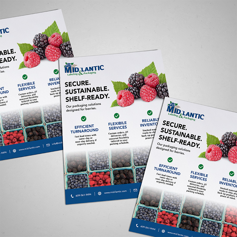 Designed an informational handout for berry products. This brochure was given to local farms to introduce them to Mid-lantic’s selection of berry packaging solutions.